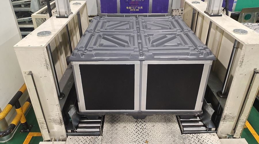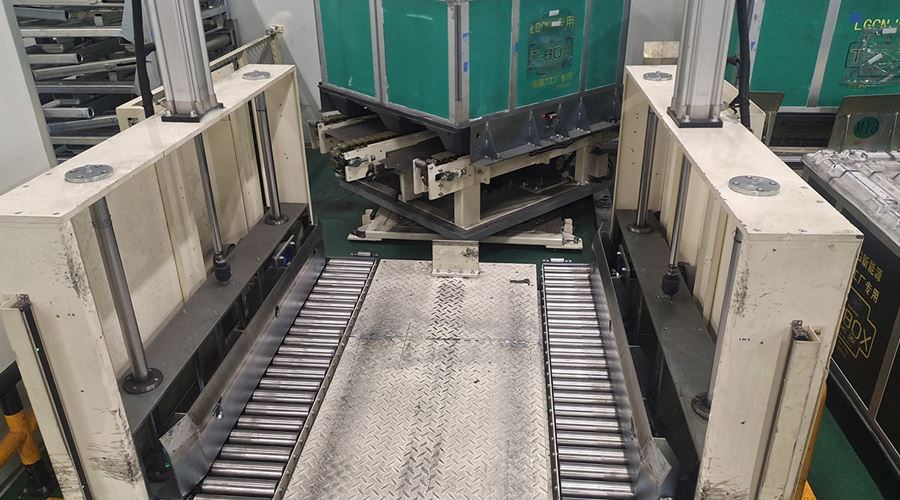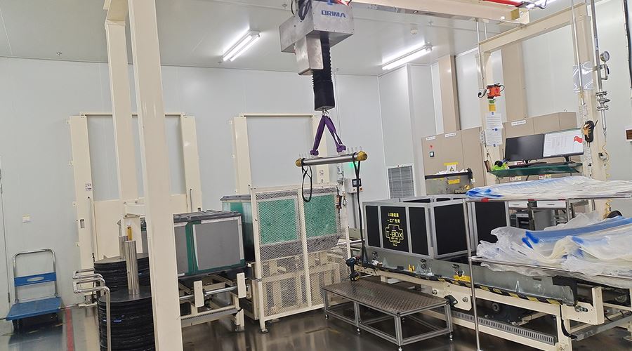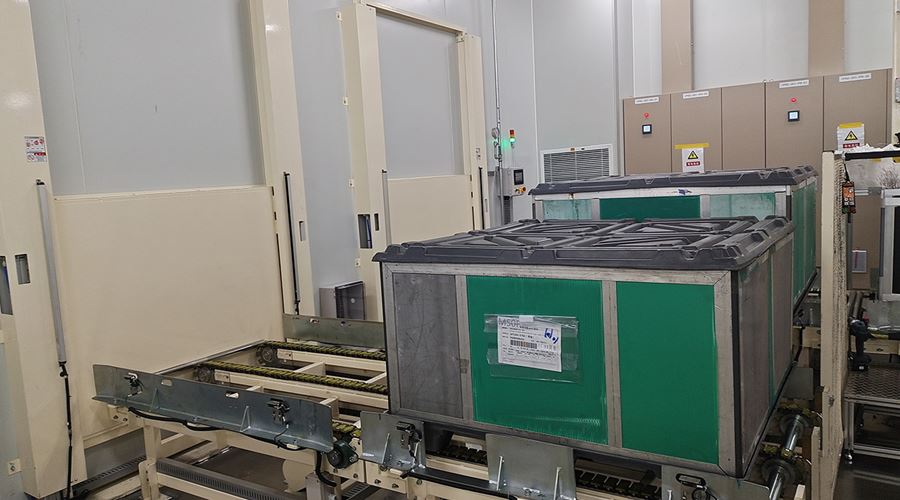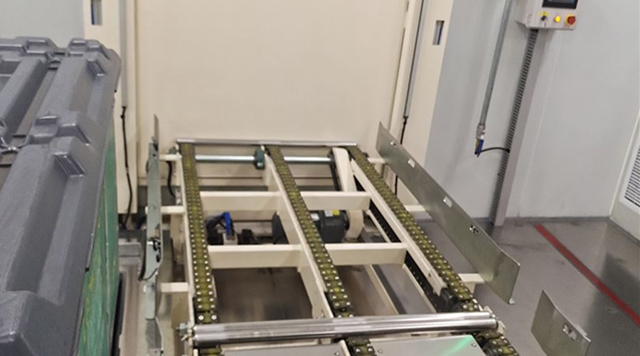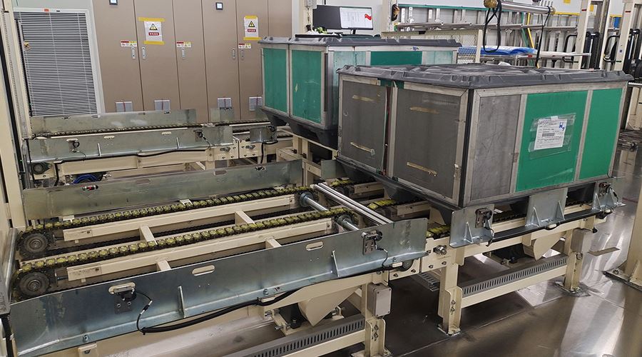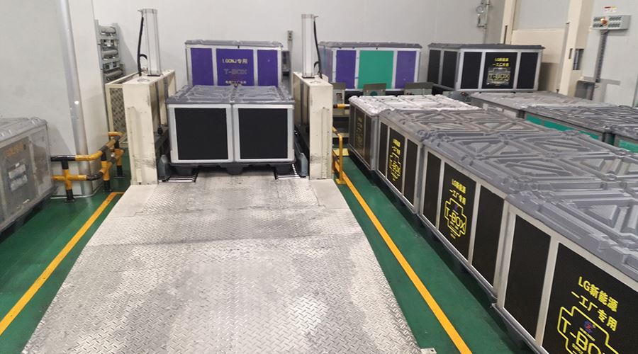 该系统将空T-BOX送入室内不同装包区域,装包完T-BOX通过物流完成自动化打包。该系统包含升降物流线、旋转物流线、RGV有轨小车、牙叉移栽设备、室内洁净航吊系统、自动打包机、360度旋转物流线及配套的安全防护设备。
